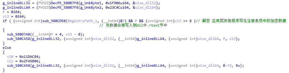 通过解析内核执行体获得ZwReadVirtualMemory、ZwWriteVirtualMemory、ZwProtectVirtualMemory三个函数,用于在注入应用层时写shellcode使用。同时取到KdDebuggerEnabled内核调试标志,若该值为1(即,内核调试为开启状态),则停止后续工作。之后解密驱动文件包含的两个不同版本的DLL模块,该模块最终会注入到被监控的进程中: