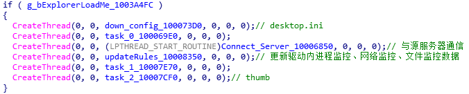 在联网下拉配置成功后,启动线程将其下回%temp%/随机.tmp/本地命名为desktop.ini,之后启动线程处理其内部字段: