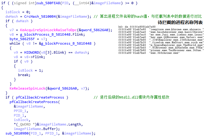 进程创建回调中,通过比对进程文件名的hash值判定当前进程是否拦截: