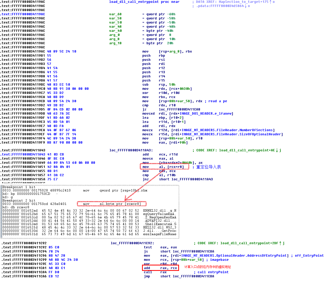 该段shellcode会加载上文提到的DLL模块,并进行导入表重定位,最后调用模块入口点执行,如下图所示: