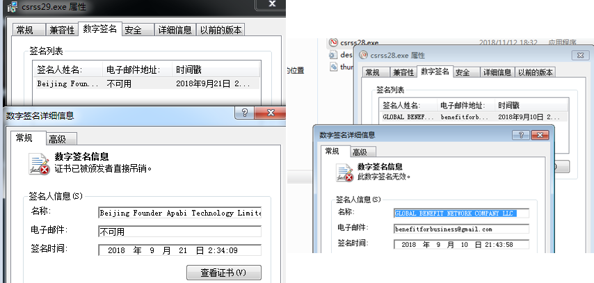 上文介绍了DLL模块会联网获取到到一个配置desktop.ini,其中有一个下载链接为hxxp://pv.mupeng1688.com/skype.exe,该文件伪造了GLOBAL BENEFIT NETWORK COMPANY LLC的签名,通过后台数据查询,可以发现在此之前,该类样本还冒用过Beijing Founder Apabi Technology Limited的签名,