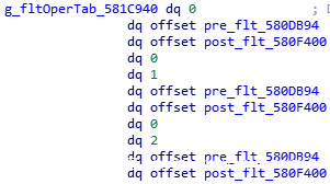 驱动模块注册了Minifilter过滤器,其所有前置与后置例程均分别设置为同一个函数: