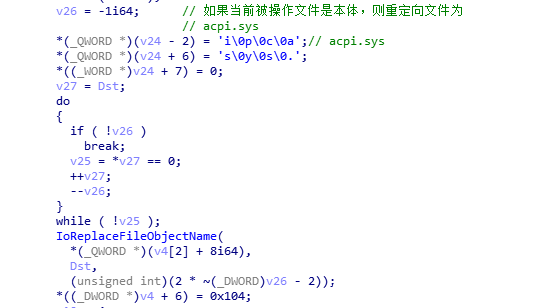 如果被操作文件为驱动本体,则使用IoReplaceFileObjectName将文件重解析为acpi.sys文件,