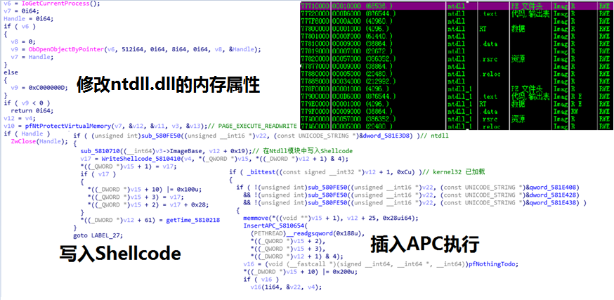 修改ntdll.dll模块的内存属性,之后在模块加载回调中写入shellcode,最后插入APC执行: