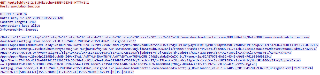 在执行Sbrg.dll模块时,恶意软件就会向C&C发送一个空白请求,服务器会返回一个XML格式的响应,其中包含一些信息,比如哈希值或者准备使用SmartScreen信誉服务器查询的Url。