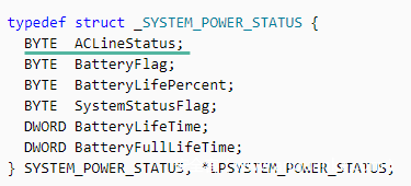 函数返回的SYSTEM_POWER_STATUS结构中包含ACLineStatus标志,可以用来判断AC电源状态,而AC电源状态可以用来判断电源是否连接到当前主机。