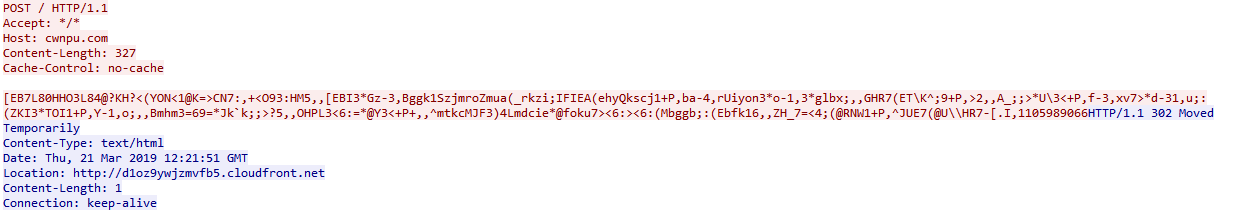 计划任务会每隔一小时执行DealPly,每次执行时,DealPly都会联系cwnpu.com这个C&C服务器,通过HTTP发送经过加密的一个请求,如图1所示。