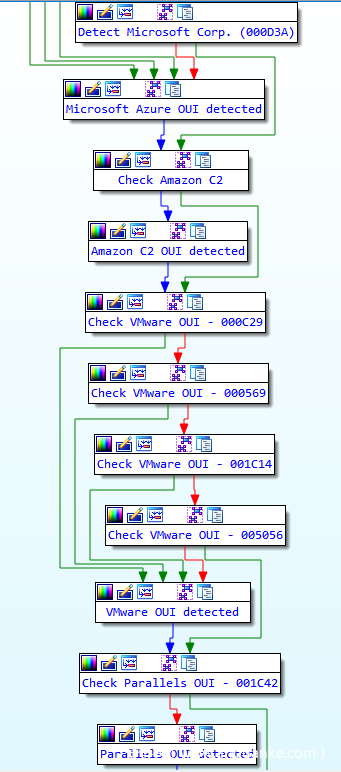 为了判断当前主机的MAC地址是否为虚拟机MAC地址,该变种会检查主机MAC地址是否属于以下厂商:Microsoft Azure、VMware、Parallels、Oracle Virtualbox、Amazon以及Xensource。