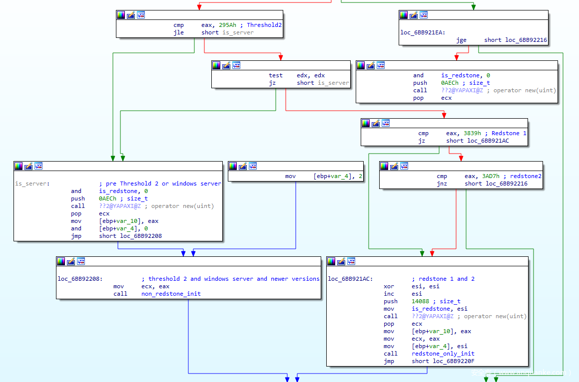 在图13中,我们可以看到某个对象的初始化过程,该对象负责与SmartScreen API的通信。该函数会根据具体的Windows版本选择一个类来处理查询请求。比如,调用redstone_only时,会调用名为_7SmscUtils2ndEd的一个类,该类中包含用于Windows 10 redstone 1以及2版本(版本号分别为14393及15063)的匹配函数。