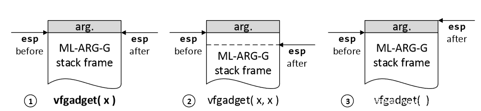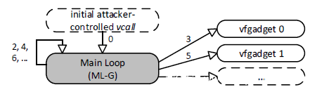正如前述所讨论的那样,通过主循环函数ML-G ,任意数目的虚函数可以被执行。而通过不同vfgadgets的配合,可以实现以下操作: