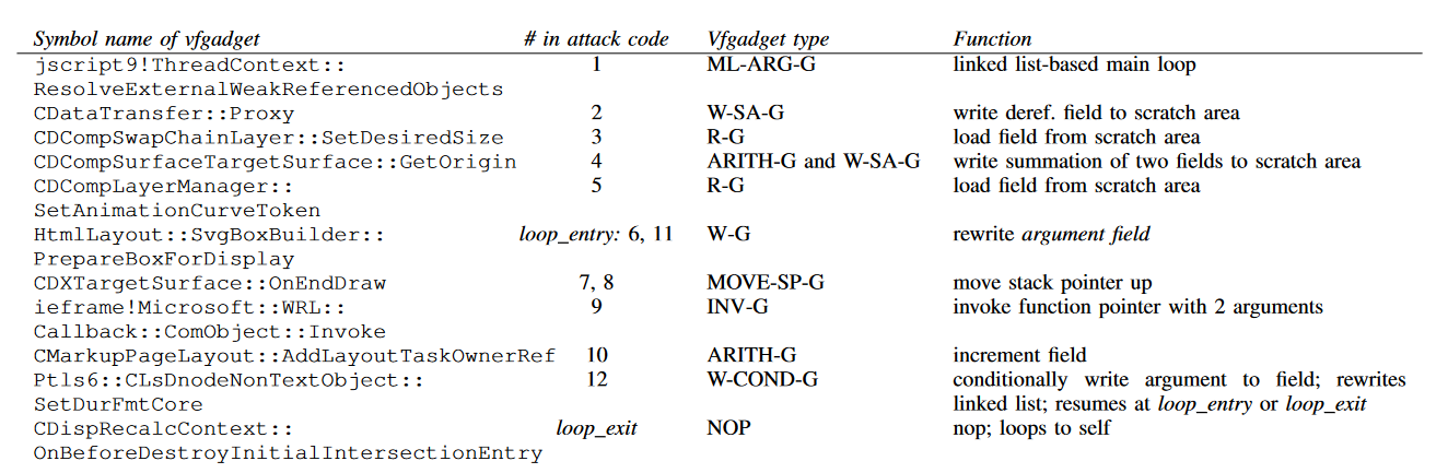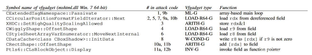 攻击64位IE 10使用了21个伪造对象,其中8个是重叠的。另外使用了mshtml.dll中8个不同的vfgadgets。攻击有两条执行路径:a.弹出计算器和b.打开画图。以下是攻击使用的vfgadgets: