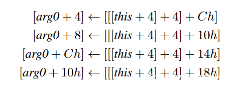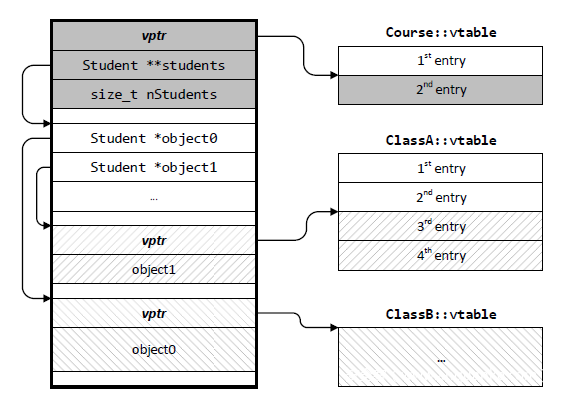 其中的object0和object1就是伪造的对象,而initial object(也就是上文提到的Course类)已经被劫持,students数组各成员已经指向相应的伪造对象,nStudents已经被设置为伪造对象的数量。接下来要做的就是通过各个vptr指针调用攻击者选定的虚函数了。