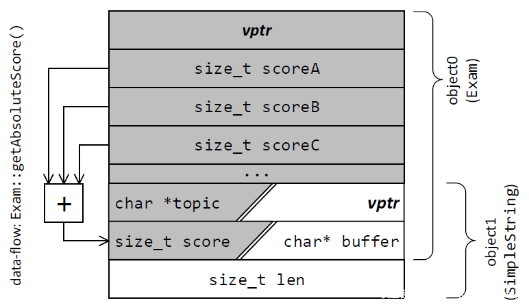 可以看到,SimpleString::set(object1)的buffer指针和Exam(object0)的score是重叠的。而buffer指针是字符串复制的目标地址,在此基础上,通过操纵score的值,实际上buffer的值也就能够控制,进而任意写的地址任意性就达成了,接下来就要解决源数据(此处的字符串s)。而注意到此处的字符串是传入的参数,那么接下来要解决的就是传参问题了。以上在内存中构造重叠的对象是COOP很常用的手法。
