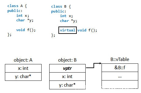 可以看到,类A不含虚函数,那么它的内存布局中就没有vptr指针和虚函数表。类B则恰好相反,在其内部偏移0处存放有vptr指针,指向虚函数表。