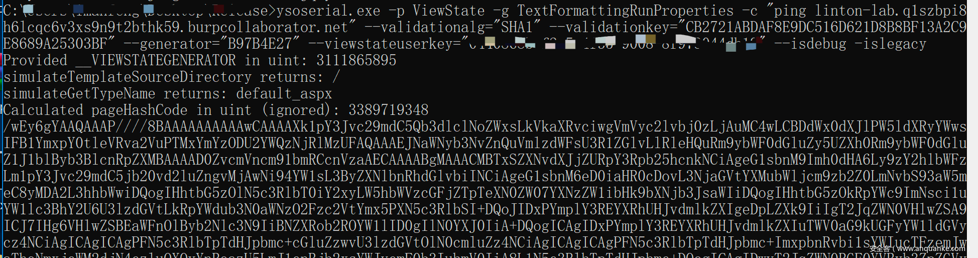 当拥有了validationkey,validationalg,viewstateuserkey,__VIEWSTATEGENERATOR,使用YSoSerial.net生成序列化后的恶意的ViewState数据: