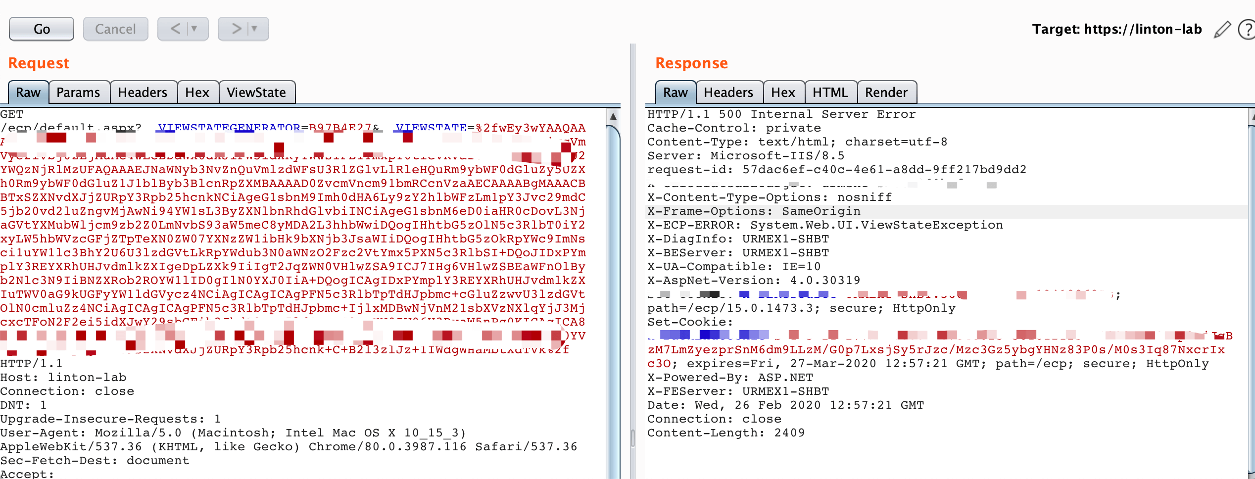这些密钥用于保证ViewState的安全性,而ViewState是ASP.NET Web应用以序列化格式存储在客户机上的服务端数据。由于密钥是静态的,攻击者有了这两个密钥,就可以使用 YSoSerial.net 生成序列化后的ViewState数据,从而在Exchange Control Panel web应用上执行任意.net代码。