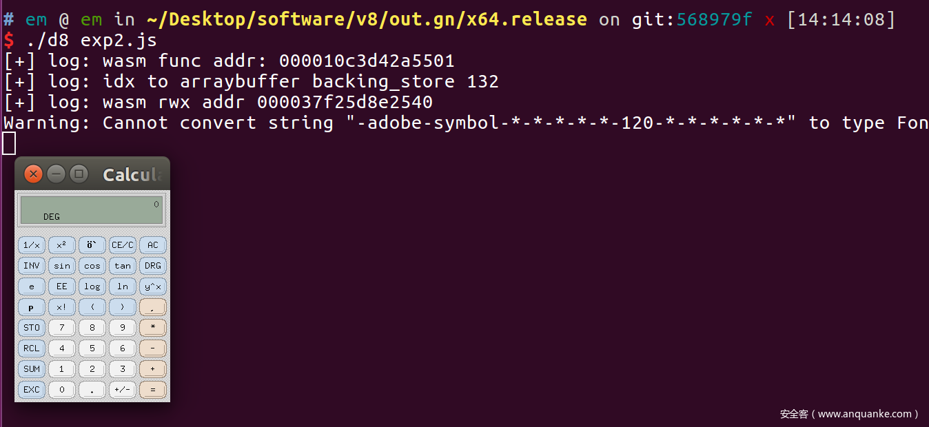有了伪造的ArrayBuffer,再结合DataView,通过不断地修改backing_store也既fake_ab.y5即可实现任意地址读写。按照wasm func addr(offset:0x18)->SharedFunctionInfo(offset:0x8)->WasmExportedFunctionData(offset:0x10)->data_instance(offset:0xc8)->imported_function_targets(offset:0)->rwx addr的顺序获取rwx的地址,写入shellcode即可。