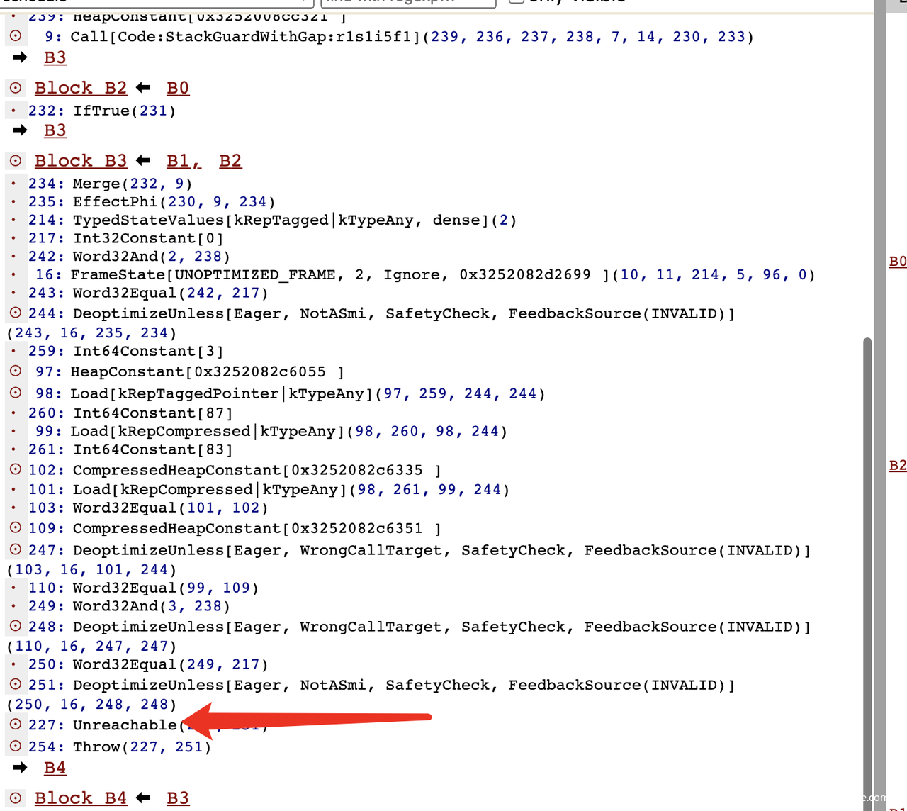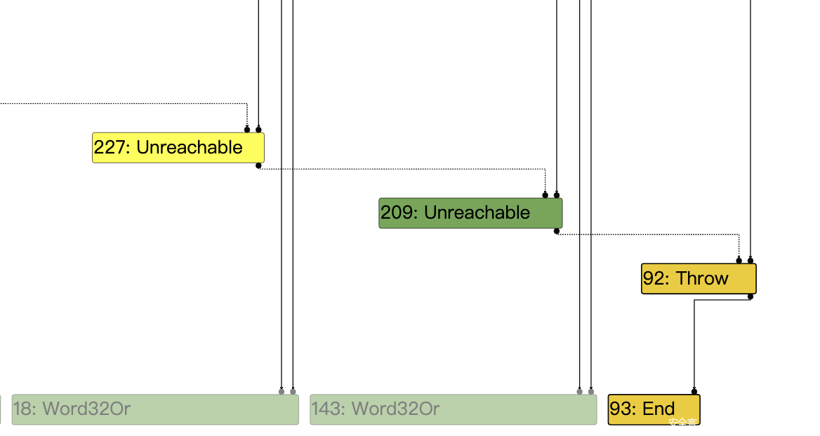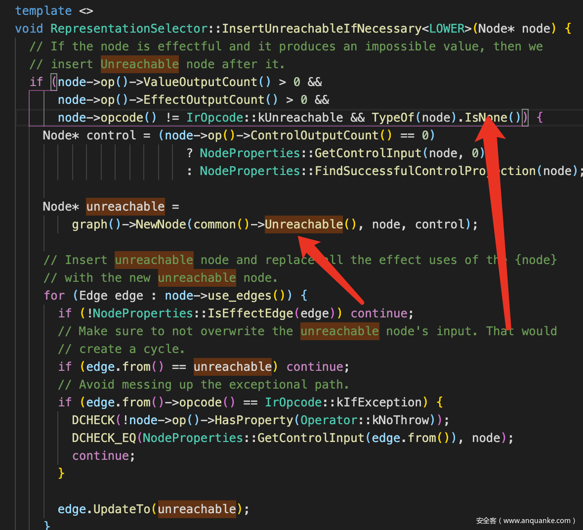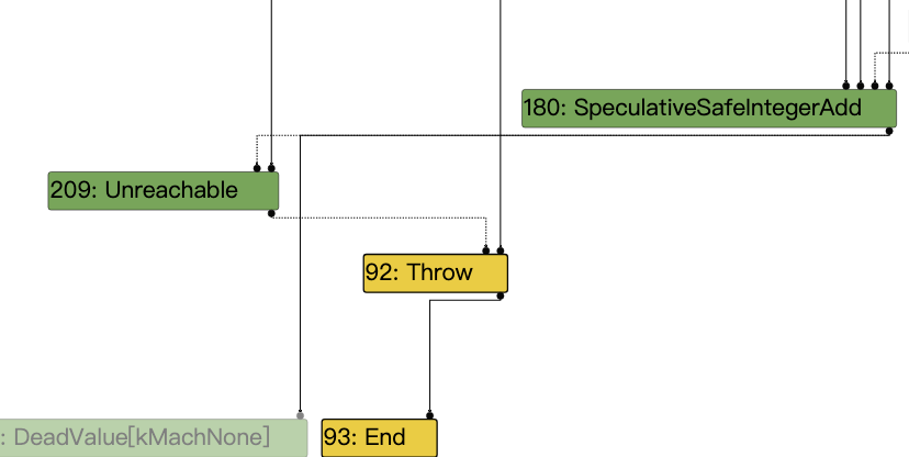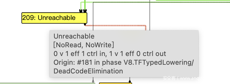 至于为什么被替换,根据issue给的解释是因为#180的两个valueinput也就是上图显示的#202节点下面的range,两个传入的都是4503599627370496,也就是patch修改之后的值,然后两个#202 被 #180操作之后为9007199254740992,超过 kMaxSafeInteger=9007199254740991,溢出了一个1,正好因为这个1导致了#180的type 被设置为了None。然后由于type 的错误,后面的也会被设置为None,然后在typerlowering阶段的DeadCodeElimination里面由于#180的none ,然后由于#180 作为#181的effect,所以在这被替换为unreachable。(patch之后 计算的值在合适的范围内就不会产生BUG)。
