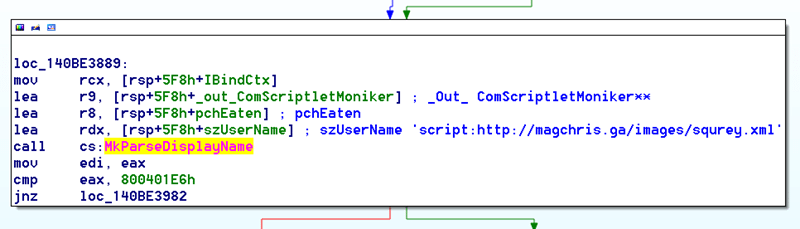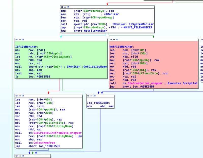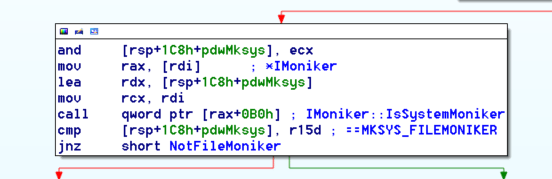 现在,Excel中的链接对象已经与一个Windows脚本组件moniker相关联,攻击者只需要使用一个API就能执行脚本。在这个moniker解析过程完成后,程序会检查所得结果是否为FileMoniker,对应的汇编代码如下图所示: