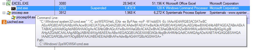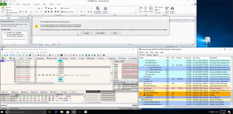 当与Scriptlet Moniker关联的链接数据传递给OleCreateLink API时,远程资源就会被下载并执行,导致受害者主机被攻陷。为了演示这一过程,我们调试了Excel程序,当用户选择“更新工作簿链接”时,Excel就会调用OleCreateLink(使用的是scriptlet moniker),执行远程脚本,最终会执行cmd以及PowerShell,如下图所示(可以仔细看一下位于下图右侧窗口的Processhacker.exe)。