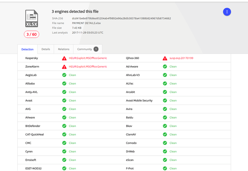 最近我们发现了一个恶意Office Excel文件,该文件可以下载并执行恶意软件。仔细检查这个文件后,我们并没有发现宏、shellcode或者DDE代码的任何蛛丝马迹。当我们将该文件提交给Virustotal上扫描时,反病毒软件对该文件的检测率比较低,这表明我们发现了一种新的、未知的攻击技术。