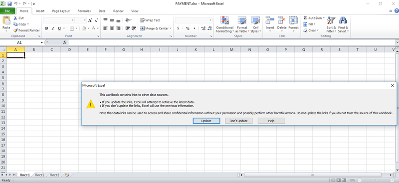 当用户打开这个Excel文件时,马上就会看到一个对话框,提示需要更新工作簿(workbook)中的外部链接。外部链接(external links)是微软Office的一个功能,作者可以通过外部资源链接来共享Office文档,无需将这些资源直接嵌入文档中,这样可以使整个文档的体积更小,更新起来也更加灵活。从这个角度来看,这种攻击看起来与DDE攻击方法非常类似,DDE攻击是最近比较流行的Office文件利用技术,通过微软的动态数据交换(Dynamic Data Exchange)功能来执行外部代码。