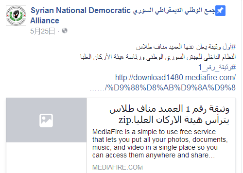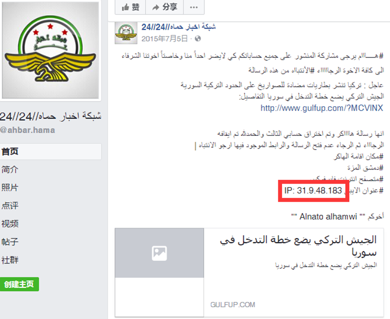 2015年7月,叙利亚哈马市新闻媒体在Facebook上发布了一则消息,该条消息称带有“土耳其对叙利亚边界部署反导弹系统进行干预,详细信息为http://www.gulfup.com/?MCVlNX”的信息为恶意信息,并告诫大家不要打开信息中链接,该链接为黑客入侵链接,相关C&C为31.9.48.183。哈马市揭露的这次攻击行动,就是我们在 2016年6月发现的针对叙利亚地区的APT攻击。从新闻中我们确定了该行动的攻击目标至少包括叙利亚地区,其载荷投递方式至少包括水坑式攻击。