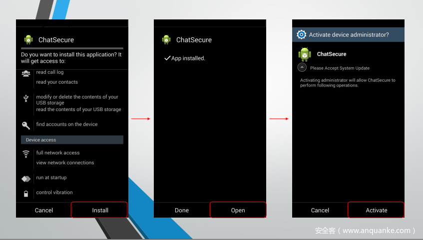 2)Android设备管理器是Google提供的一套API,允许用户以system权限管理设备,一个APP激活设备管理器后,不能被轻易卸载(必须先取消激活)。这些RAT程序动后诱导用户激活设备管理器,然后隐藏图标在后台运行。