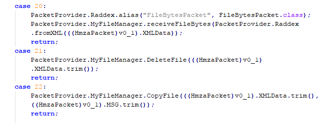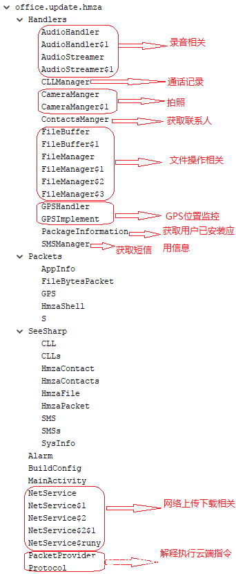 - Android端后门程序功能主要包括定位、短信拦截、电话录音等,并且还会收集文档、图片、联系人、短信等情报信息。