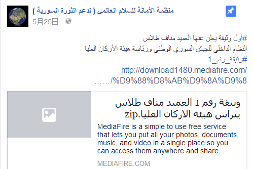 第一次攻击行动集中在2014年10月到2015年7月,该期间攻击组织主要使用开源远控njRAT和Downloader进行攻击,攻击载荷并不复杂,使用的C&C主要为bbbb4.noip.me和31.9.48.183。但是2015年7月,该组织使用的C&C(31.9.48.183)被叙利亚哈马市新闻媒体在Facebook曝光。