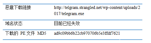 PC端间谍软件主要伪装成Telegram、Chrome等升级软件,并通过挂载在具有迷惑性的下载网址上引诱目标下载安装。攻击者注册了一系列类似于http://telgram.strangled.net/、http://chatsecurelite.us.to这种具有迷惑性的网址,并且上面都挂着部分正常样本用于干扰、迷惑。表2是PC端RAT程序具体下载链接和链接对应文件MD5。