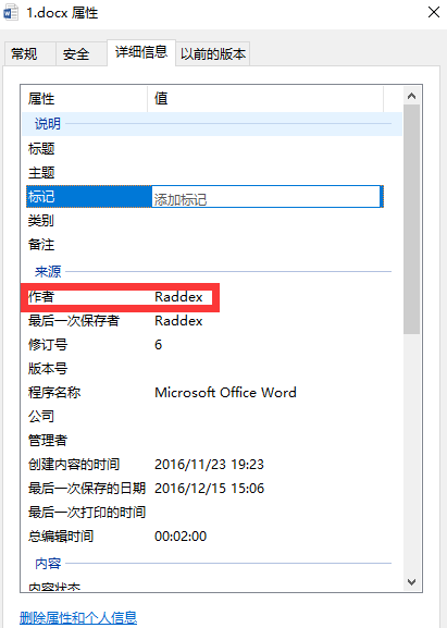 查看1.docx的属性发现该文件有作者信息Raddex。