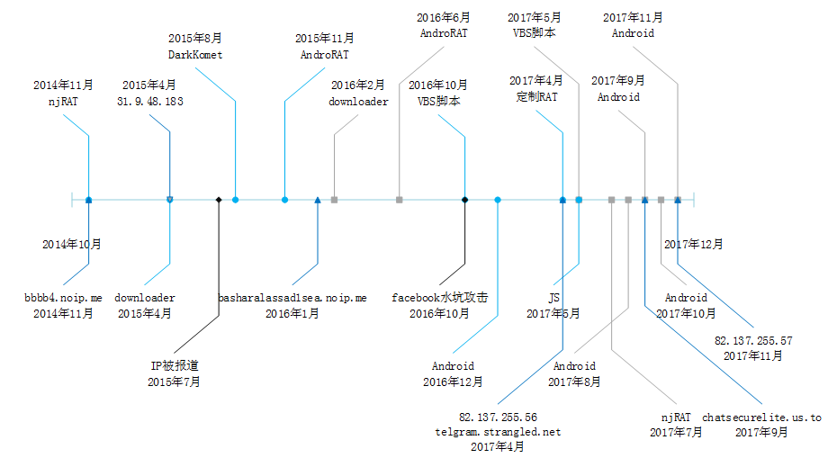 | 第二次 | 2015.8 – 2016.11 | DarkKomet、VBS Backdoor、AndroRAT | basharalassad1sea.noip.me