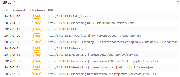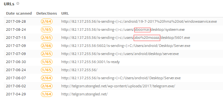 上表是PC平台中部分PE文件的PDB路径,这个路径就是恶意代码作者本机的文件路径,从相关用户名“Th3ProSyria”、“aboomar”来看,这些用户名更多出现在阿拉伯国家。
