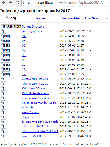 第三次攻击行动集中在2016年12月到至今,该期间攻击组织表现尤为活跃,使用的攻击载荷变得更加丰富。在2017年4月使用了telgram.strangled.net钓鱼页面进行水坑攻击,并且根据telegram升级程序的步骤制作RAT进行攻击,攻击平台包括PC与Android,C&C服务器也改变成82.137.255.56。此外,在2017年5月,首次出现了JS后门,并结合前期的VBS后门、RAT同时攻击。在这次攻击中需要引起重视的是,在2017年9月,攻击者开始使用域名chatsecurelite.us.to替代原有域名telgram.strangled.net进行水坑攻击,并着重针对Android平台进行攻击,开发了一系列不同伪装形式的RAT,最近两个月,攻击者基本上都只对Android平台进行攻击。