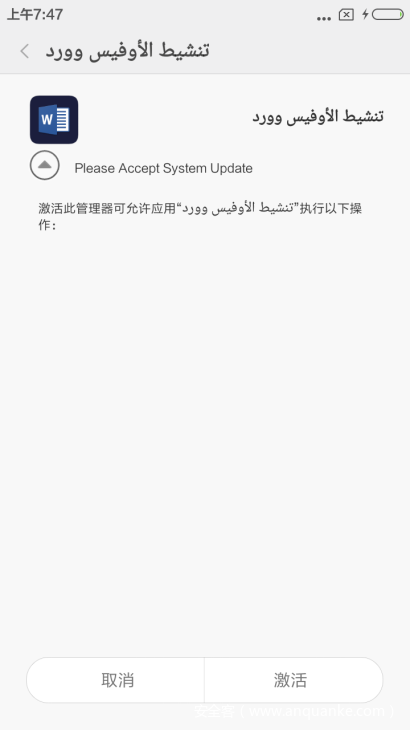 文档诱导主要是指攻击者通过正常PDF、DOC文档,提醒用户到恶意URL处更新最新程序或诱导用户安装APK文件,从而导致用户中招。