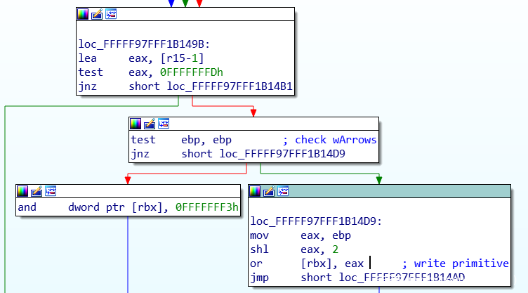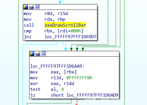 不过在讨论回调函数之前,我们先把后面的看完。和设置水平滚动条的逻辑类似,但不同的是如果 wArrows 设置了禁用了,并且前面触发了 uaf 的话,这里就可以对释放后的内存进行一次按位或运算,比如 wArrows 为 0x3,而 tagSBINFO.wSBflags 为 0x2,那么操作完后值就变为 0xe 了。
