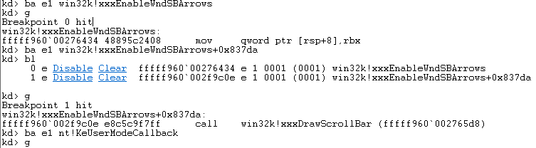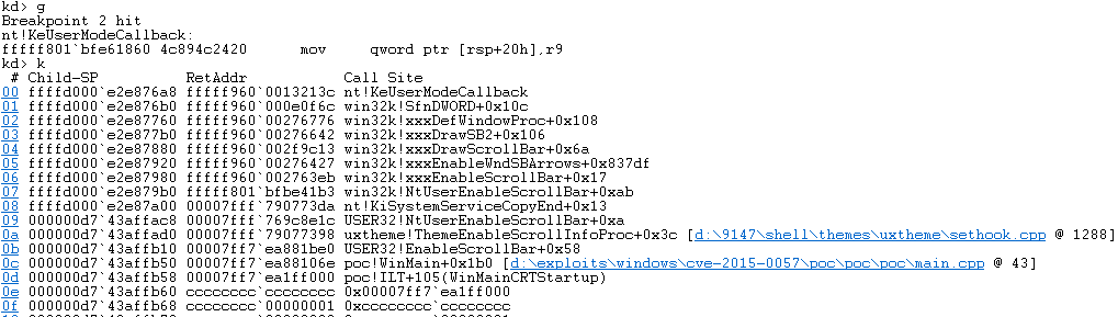 选好断点位置,在 Drawscrollbar 之后对 nt!KeUserModeCallback 下断点,虽然很容易在其他地方断下,但是多试几次,就能断在我们的调用链中。
