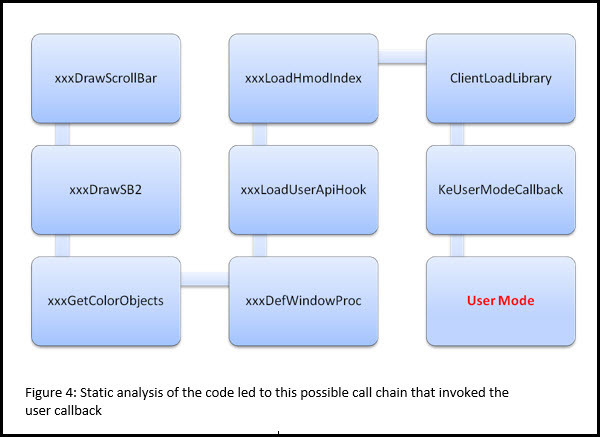 执行 xxxDrawScrollBar 函数得过程中会调用 ClientLoadLibrary 函数,其中又触发了 KeUserModeCallback 函数,我们要想办法弄清楚KeUserModeCallback 函数调用了什么,然后尝试劫持该调用。