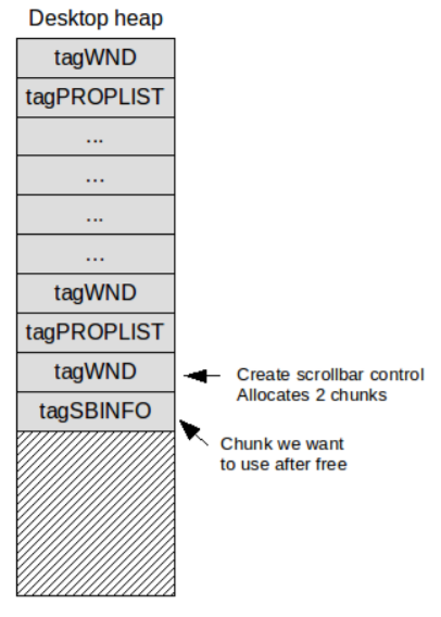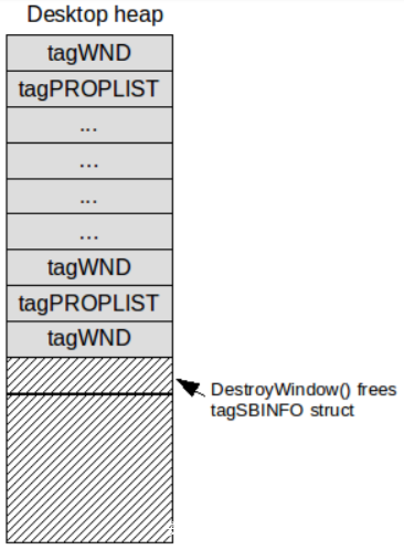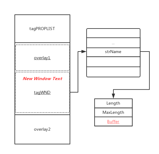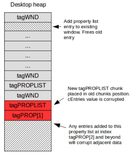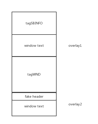 触发 uaf 后 tagSBINFO 位置处会被替换成 tagPROPLIST 结构,然后调用 setPROP 修改相邻 window text 的 _HEAP_ENTRY 将其 size 域覆盖成 sizeof(overlay1) + sizeof(tagWND) + sizeof(_HEAP_ENTRY),然后释放掉,分配一个 window text 来操作里面的数据。