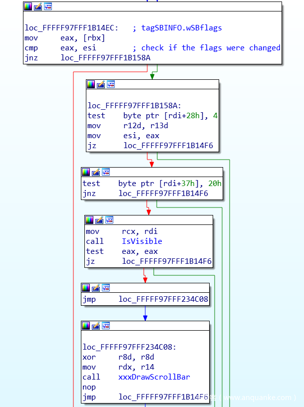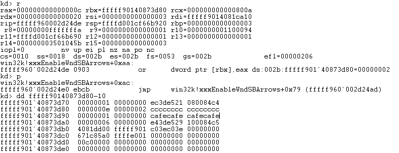 以上代码是未经修补的漏洞代码,在适当的情况下 win32k!xxxDrawScrollBar 可以触发一个用户态调用让 tagSBINFO 对象指针即 rbx 被释放掉,而之后以上代码又使用了释放后内存中的值。简单来说就是某种情况下这个函数会触发一个函数回调,而我们可以控制这个函数回调,运行我们指定的代码。