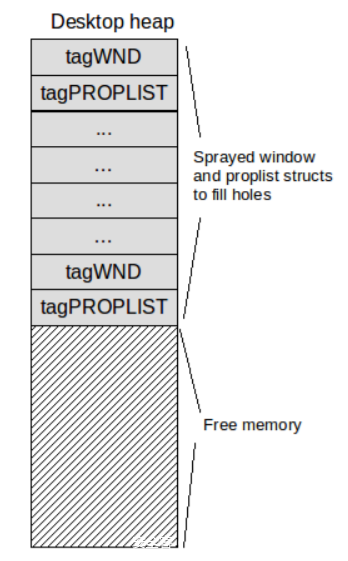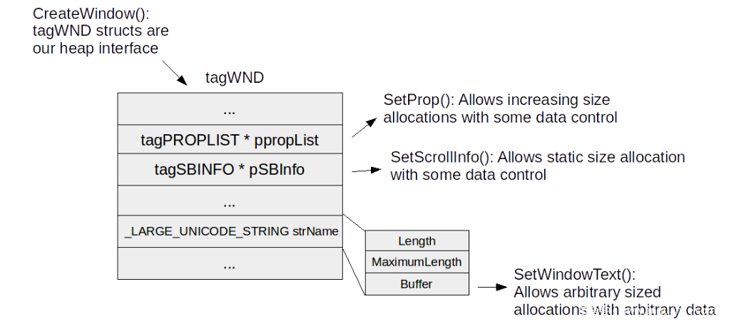 虽然不能直接覆盖 strName.Buffer,但是我们可以拿 _HEAP_ENTRY 开刀,而且 SetPROP 刚好可以完全控制下一个堆块_HEAP_ENTRY 关键的数据结构,修改它的大小让其包含 tagWND 结构,然后释放掉它再分配一个 tagPROP + tagWND 大小的堆块,这样我们就可以控制堆块的内容来修改 tagWND。现在调整一下风水布局,和 Ncc Group 的略有不同,用 window text 结构可以任意分配内存大小,这样更为方便,新的堆布局如下: