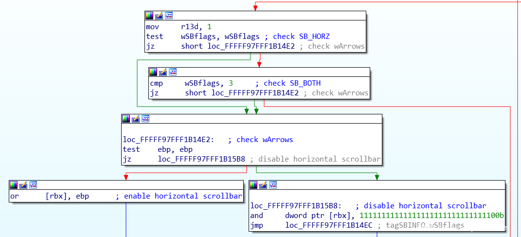 相关的符号在 win7 版本中有保留,可以用 windbg 查看,从代码层面来看,函数读取 pSBInfo 值,也就是 tagSBINFO 结构,并且判断是否位空指针,如果该值为空而 wArrows 参数不为空,那么就会给窗体分配一个 tagSBINFO 结构,scrollbar 属性相关的 bit 位设置为 0。否则就沿用已有的 tagSBINFO 结构中 scrollbar 属性的信息。