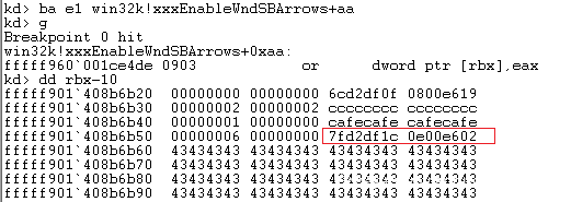 现在我们能用任何想要的数据覆盖 strName.Buffer 的指针,虽然 tagWND 的其他数据需要修复,不过这可以从用户空间读取,桌面堆会映射到用户空间,准备好 tagWND 的全部数据,把 Buffer 指针的值修改成目的地址,然后申请这部分内存。