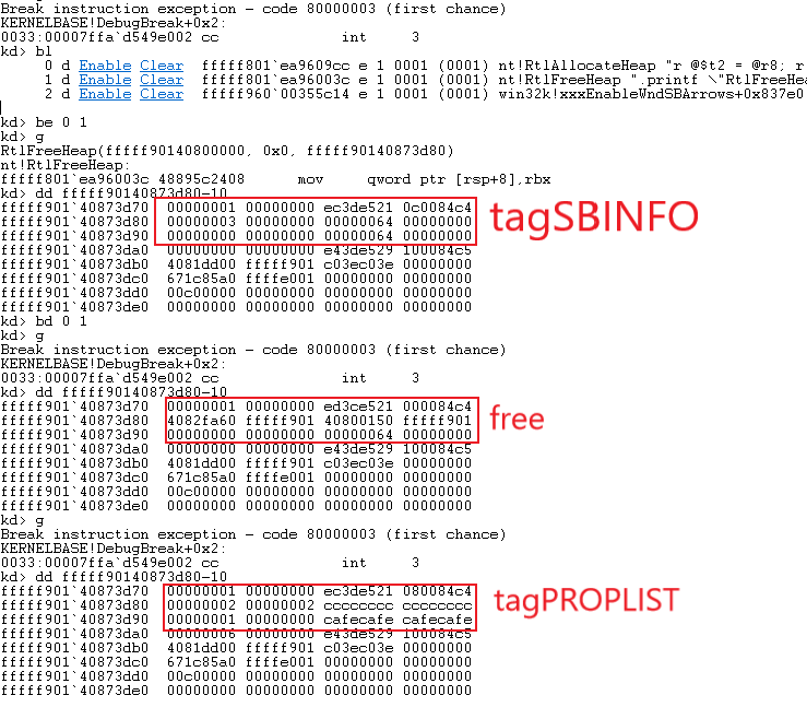 这两组 tagWND 的位置可以不用管,然后我们用第一组 tagWND 也就是 hwndlist1 做两件事,一个是分配 0x30 字节大小的 tagPROP 为同样 0x30 字节大小堆块的 tagSBINFO 占位,