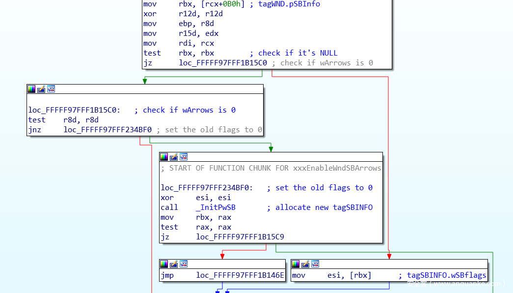 漏洞出现在内核的 GUI 组件中,也就是 win32k.sys 模块,之前从来没有了解过 win32k 有关的用户态回调函数的利用,不过这里有篇相关的 paper 可以参考,帮助我们熟悉 win32k.sys。分析资料中直接给出了漏洞所在位置,也可以自己尝试从 patch 分析一波,我尝试对比了一下 patch 版本和原版本的 win32k.sys,有几十处函数有改动,没有任何思路遂放弃。从资料中找到漏洞代码,漏洞位置在 win32k!xxxEnableWndSBArrows,抛去如何定位漏洞的部分(因为不会 ? 233),让我们直接理解漏洞原理: