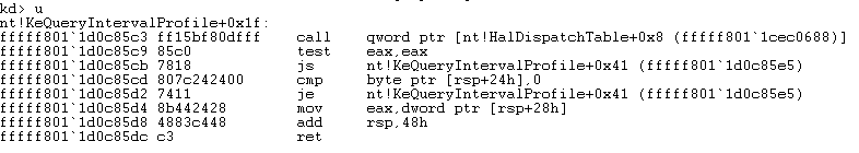 现在控制了 strName.Buffer 也就可以任意地址写了,后面的利用的套路都是通用的,可以用这个写操作原语覆盖 nt!HalDispatchTable 的第二项,然后在用户态调用 NtQueryInternalProfile() 函数,然后内核中会执行 nt!KeQueryIntervalProfile,该函数中有这样一个代码片段