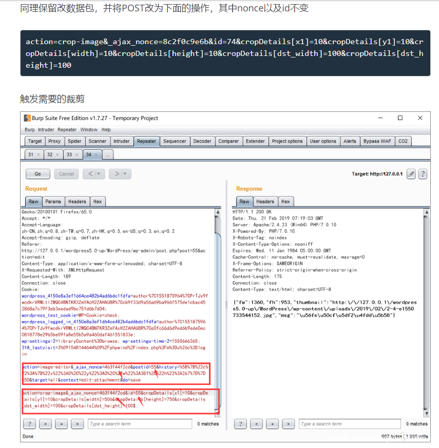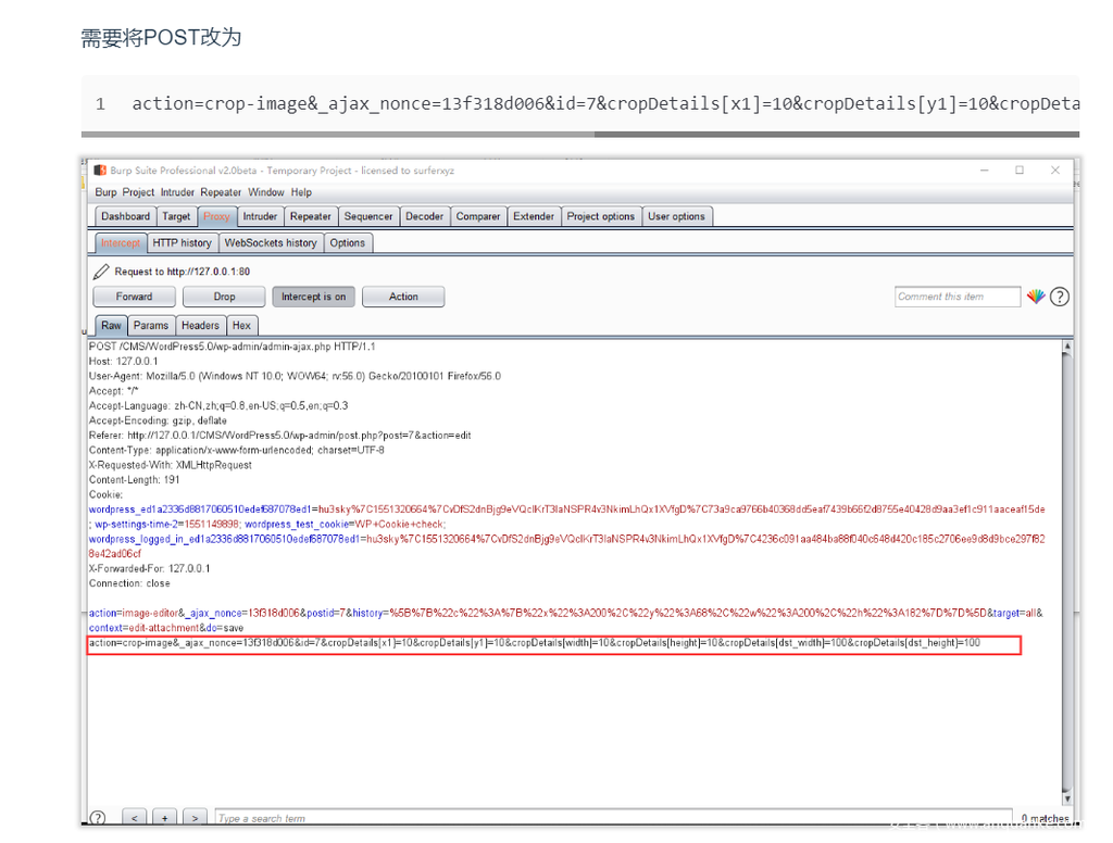 所以在我看来这个方法才是最应该被RIPS挖到的点。action=crop-image不是本身发出的请求,而是我们改了post包去构造触发这个裁剪,达到写文件的目的。
